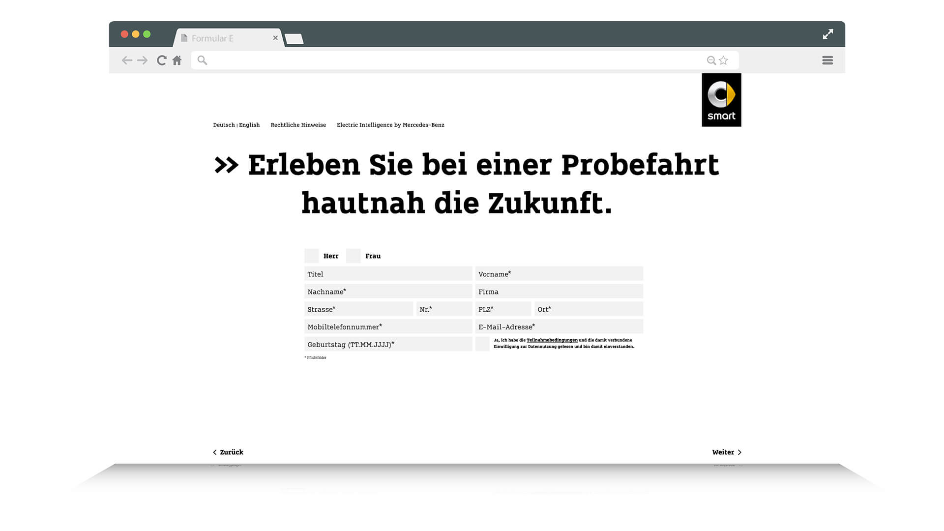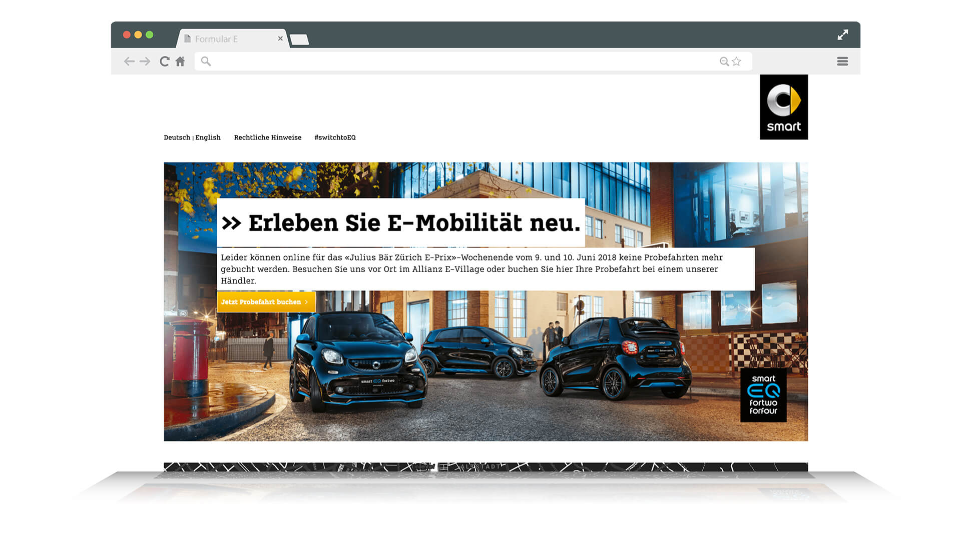 JEFF Zürich GmbH erteilte uns den Auftrag für smart ein Probefahrtenbuchungssystem für den Probefahrtenbetrieb der smart EQ forfour und smart EQ fortwo Fahrzeuge zu entwickeln. Zusätzlich konnten die Probefahrtenslots über ein flexibels Backend verwaltet werden. Unser Auftrag umfasste folgende Punkte: